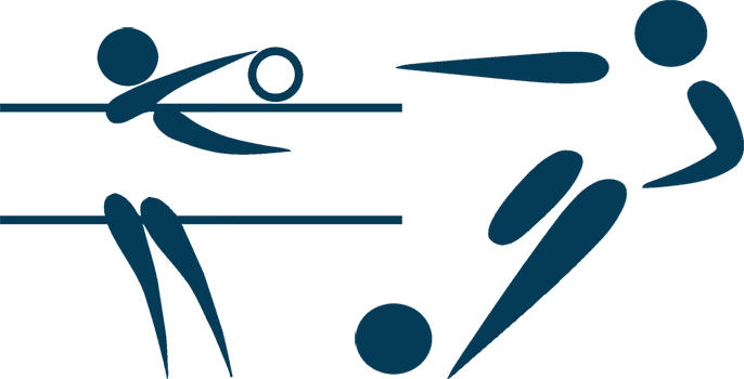 wo Blue stick figures, one volleyball and one soccer.