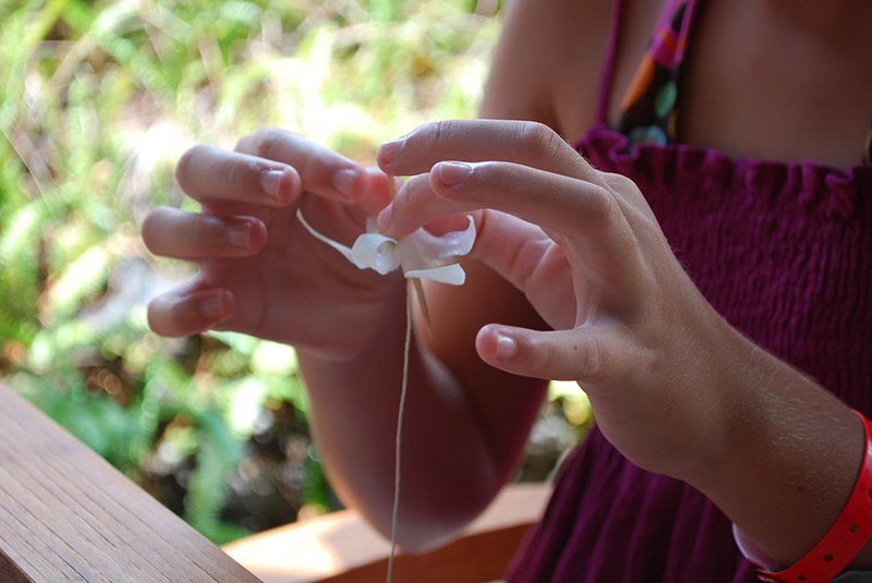 pair hands putting a flower petal on string.
