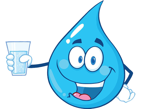 A drop of water with a face and hands. One of the hands is holding a glass of water.