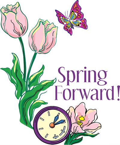 Clipart with tulips, butterfly, clock and says “Spring Forward”
