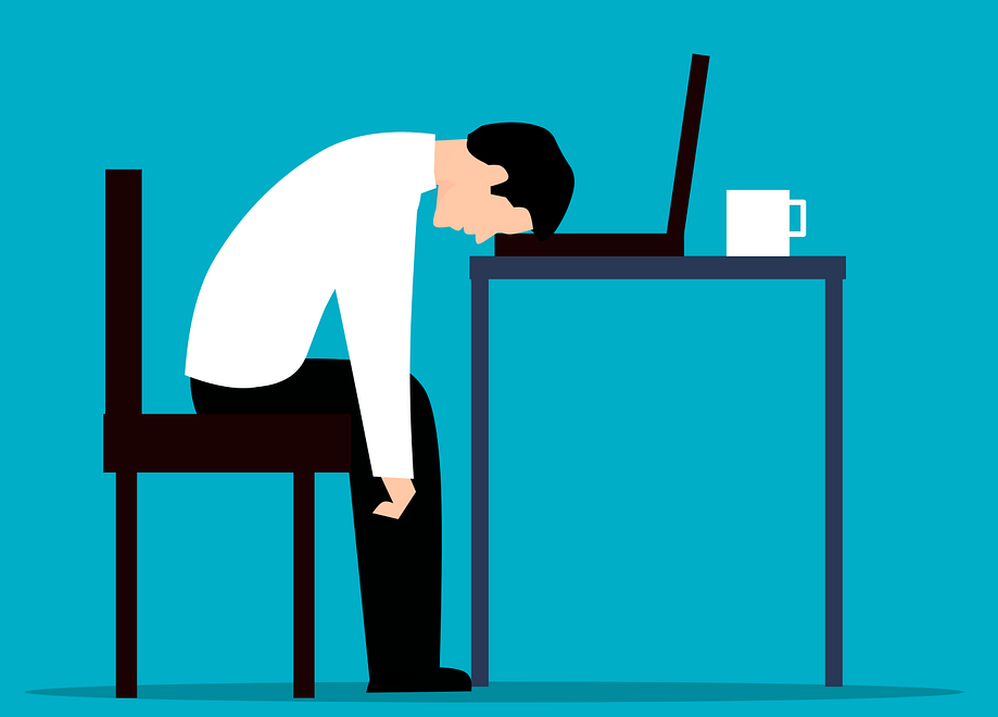 Image of employee with head on his desk.